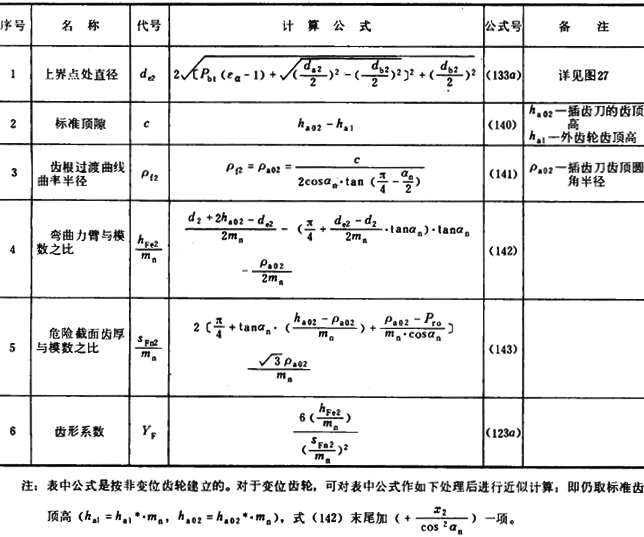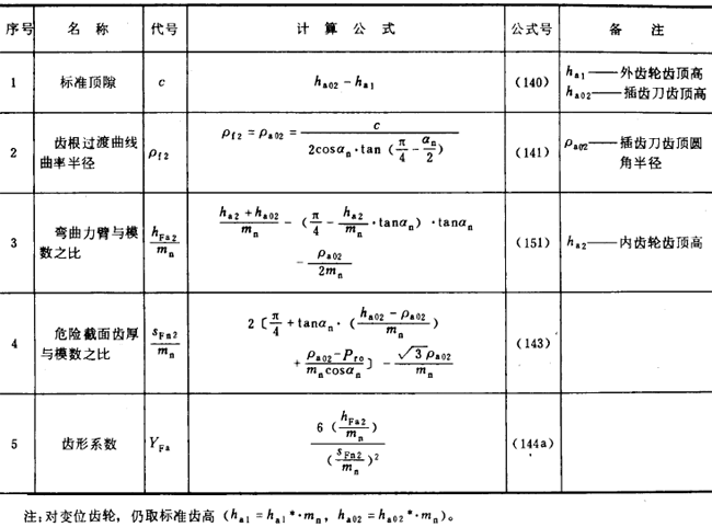 内齒輪的齒形系數YF不僅與齒數和變位系數有關,且與插齒刀的參數有關。爲瞭簡化計算,可近似按替代齒條計算(見圖27)。替代齒條的法向齒廓與基本齒條相假,齒高與内齒輪相同,法向載荷作用角αFen等於αn,並以腳标2表示内齒輪 。有關計算公式見表16(适用於Z2>70)。