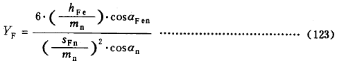 式(123)适用於标準或變位的直齒輪和斜齒輪。對於斜齒輪,齒形系數按法截面確定,即按當量齒數ZV進行計算。大、小輪的齒形系數應分别確定 。ZV應按式(128)計算,或由圖30至圖32查取。