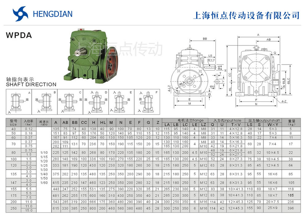 WPDA減速機外形尺寸/選型指南 - WP鑄鐵蝸輪蝸杆減速機