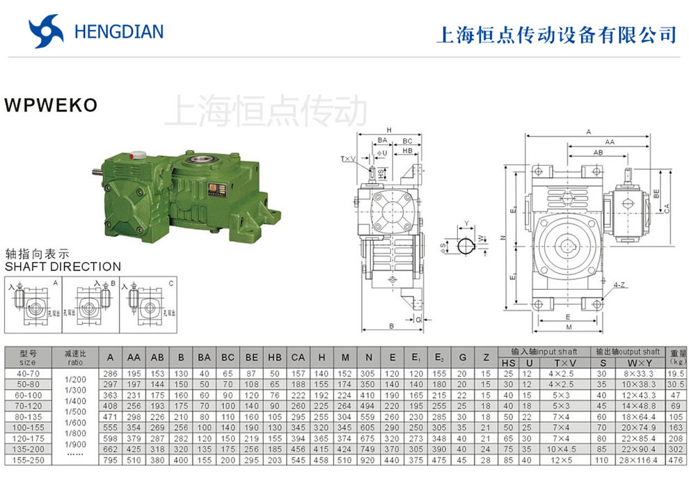 WPWEKO雙級萬能型蝸輪蝸杆減速機選型指南,WPWEKO雙級減速機軸輸入,孔輸出.WPWEKO萬能型減速機軸指向表示方法.機座号40-70到155250,速比200到900.WPWEKO減速機的外形安裝尺寸